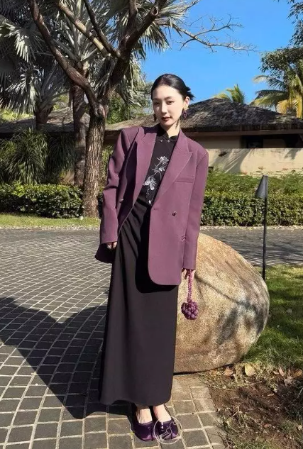 低明度的紫紅色西裝,襯膚顯白又帶點古典氣息,很適合疊穿中式刺繡旗袍裙,配雙緞面同色系薄底鞋,韻味十足。